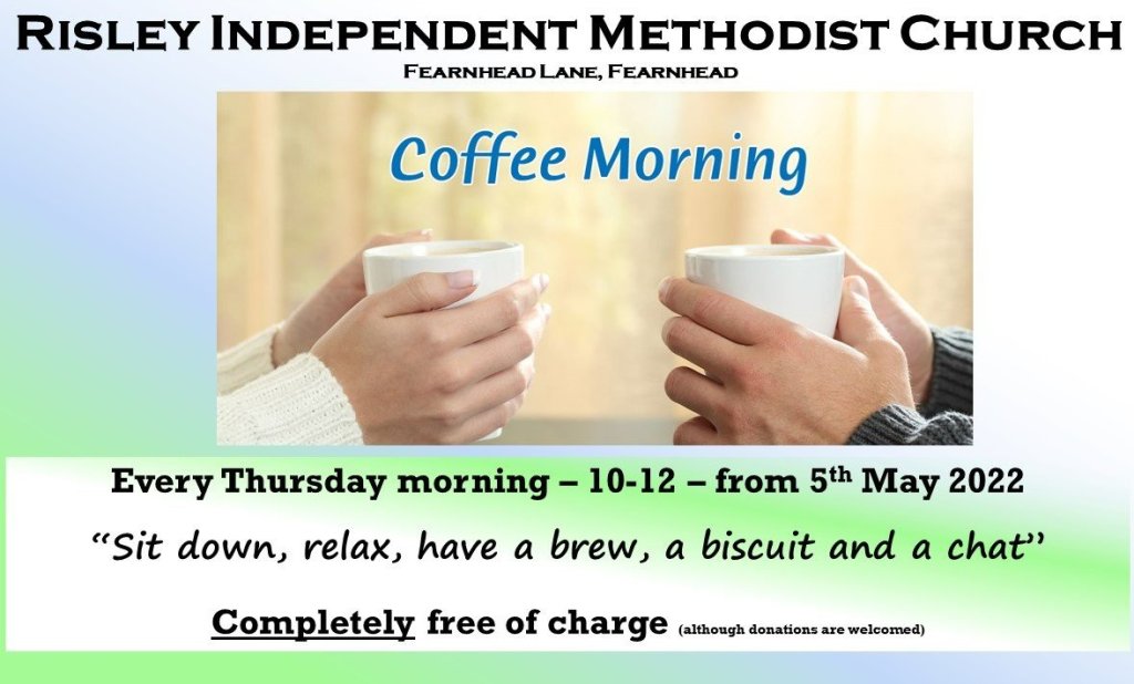 Each Thursday morning from 10:00am our church is open for a coffee morning. Tea, coffee & biscuits will be served until 12 noon. If you would like to visit you will be more than welcome – there is no pressure to do anything but relax and have a chat. From mid-January 2023 we will also provide a lunch (usually soup & a roll, followed by a slice of cake). The lunch will be served from 12:00 until 1:30. All of the food and drink provided are completely free of charge – although donations are welcomed.