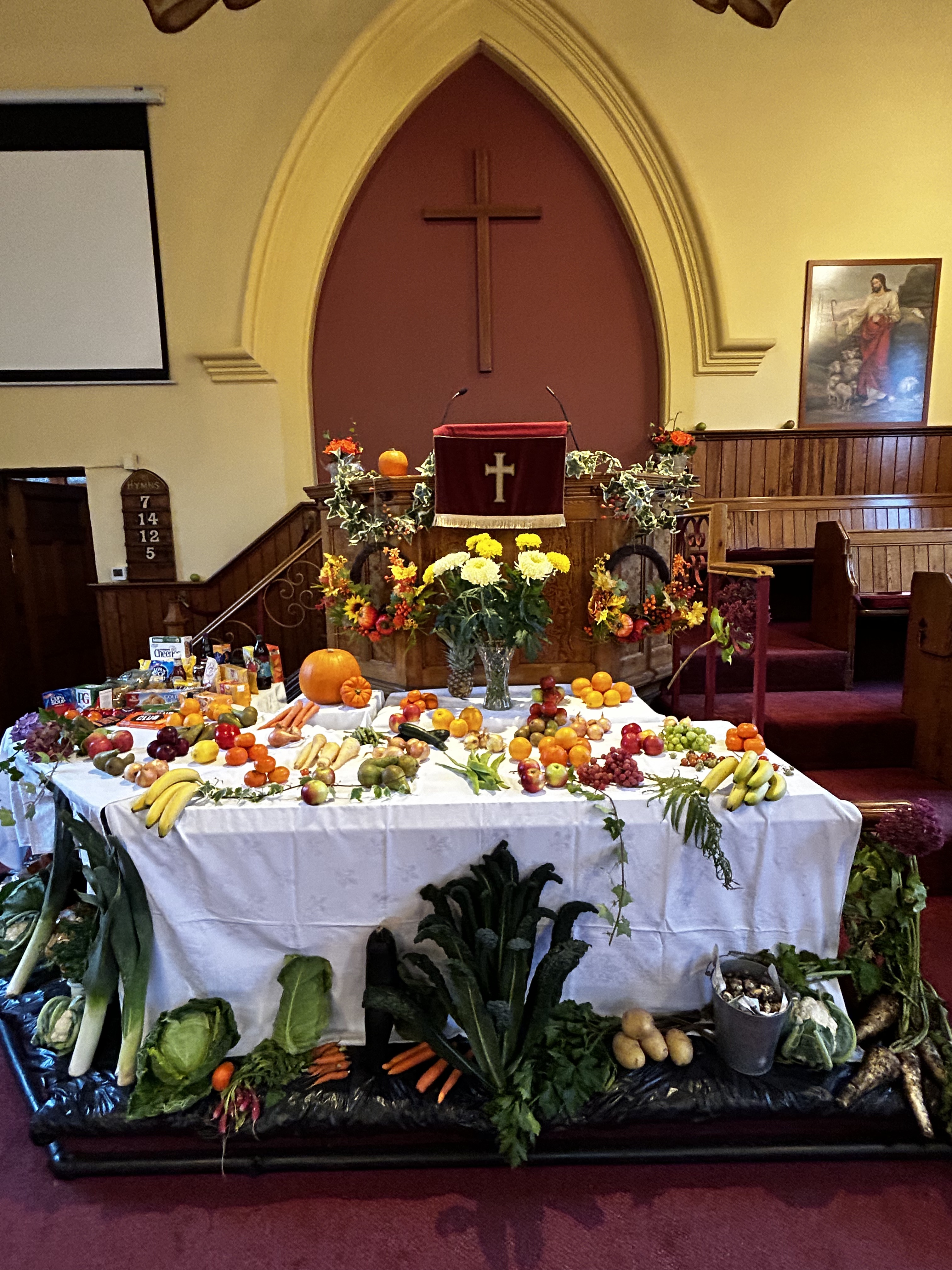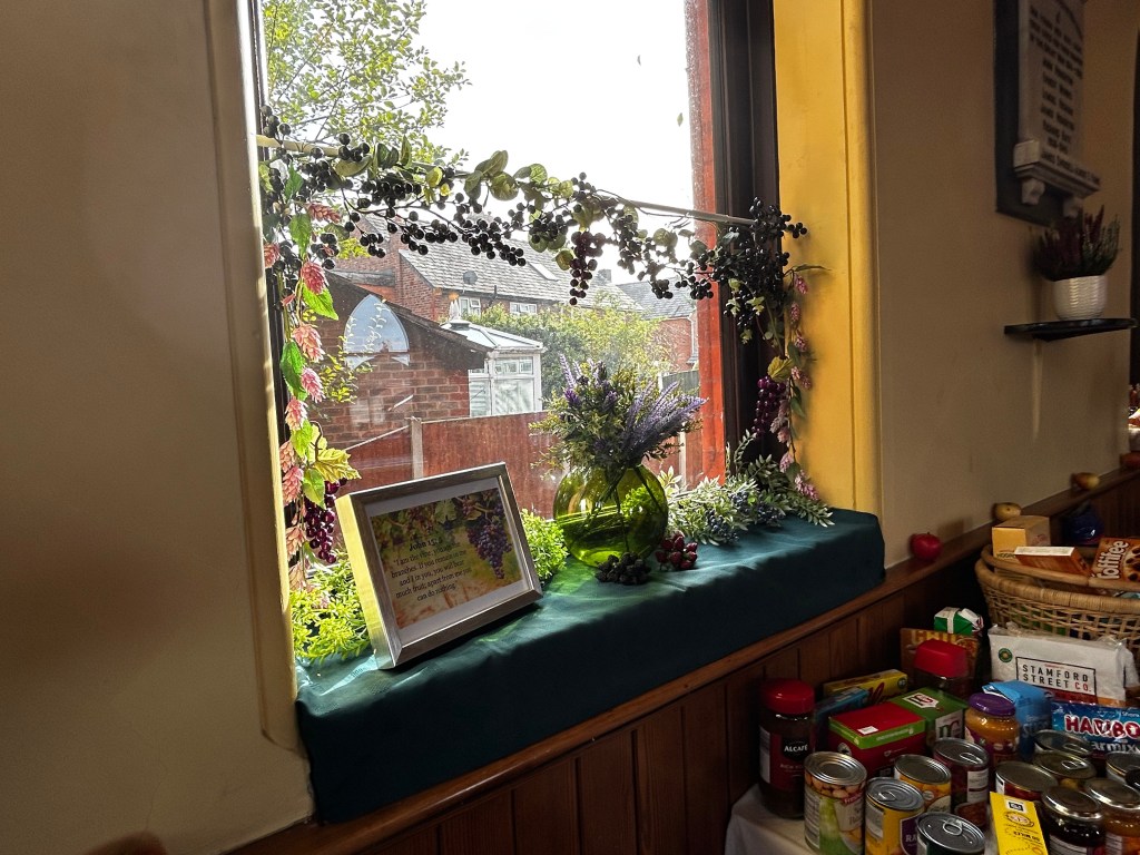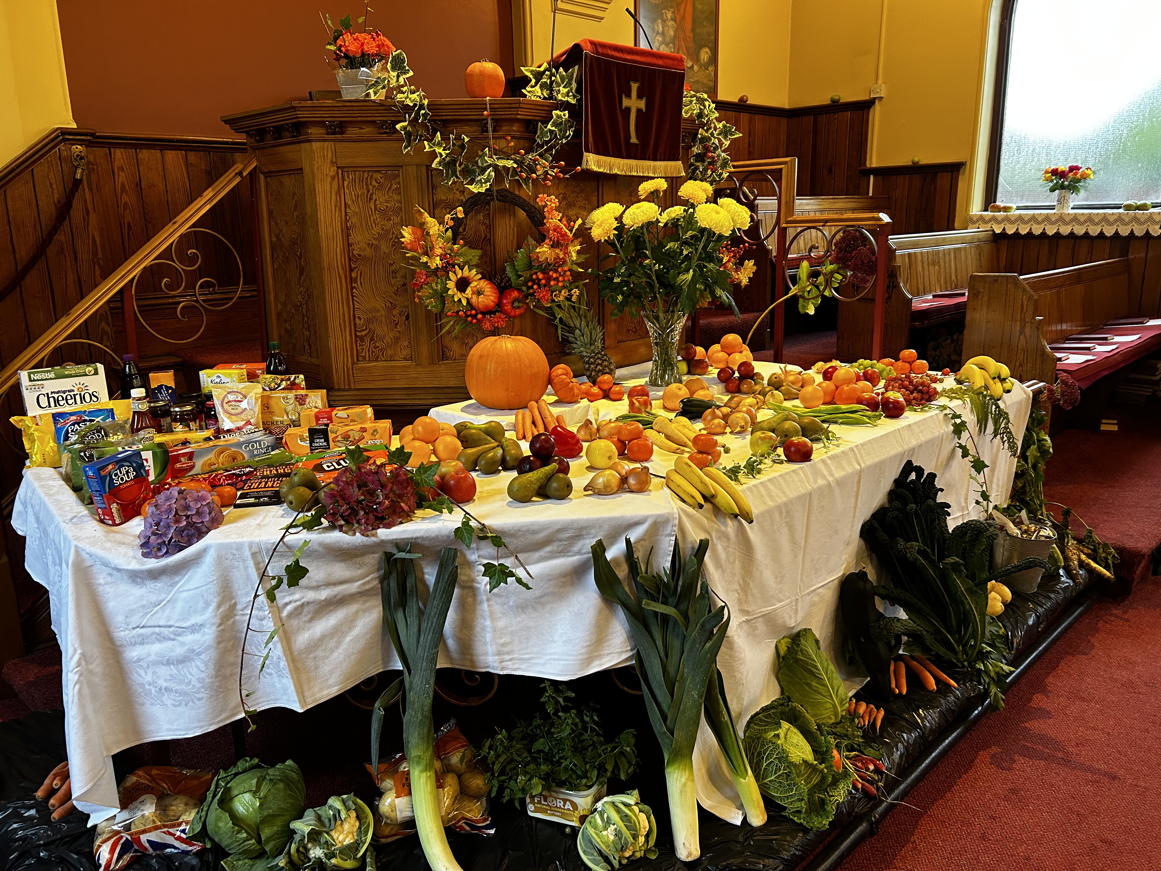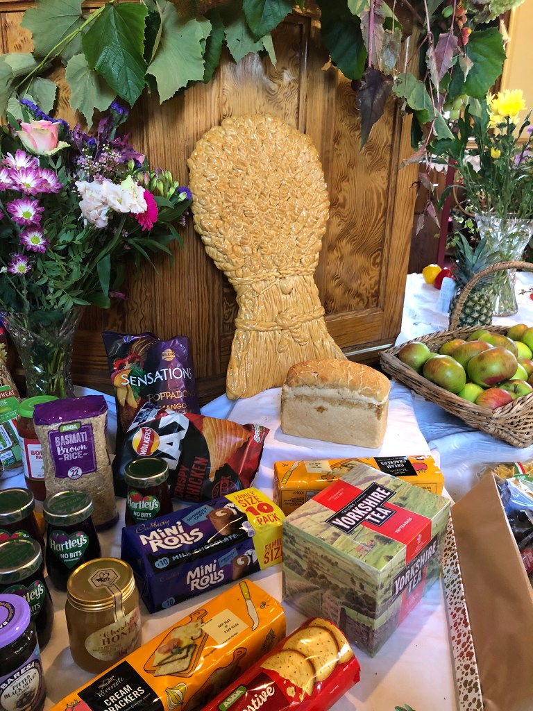 Our Harvest thanksgiving services took place on Sunday the 2nd October. The church was beautifully decorated with an amazing array of produce and goods. The fresh stuff was passed on to members of the congregation and all tinned, packet or dry goods are being donated to the Warrington Food Bank. Here are a few photos from the display…
