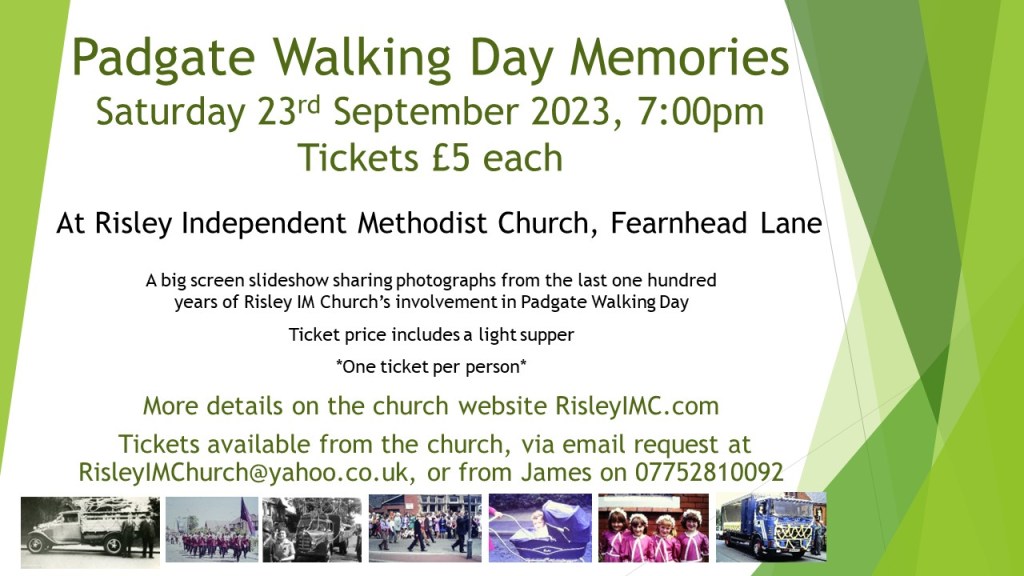 On Saturday 23rd September at 7:00pm we will have an evening of history, nostalgia and food! We have recently digitised a treasure trove of photographs from around sixty years of our church’s involvement in Padgate Walking Day. Some of those photographs have never been seen in public before so… will you see yourself on some of them? There’s only one way to find out… We will be showing them as a big-screen presentation with an accompanying talk. We will also serve a light supper which will be included in the ticket price. Tickets (£5 each) are available from the church or on request via our email address risleyimchurch@yahoo.co.uk.